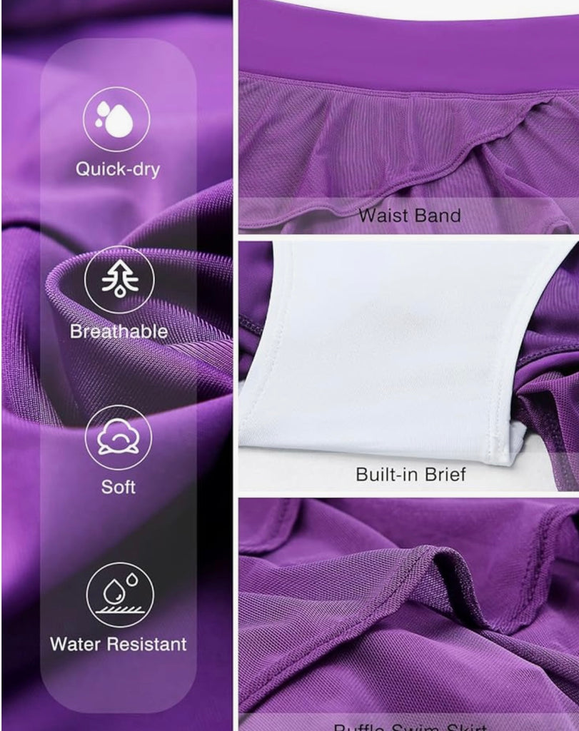 Flattering, feminine, and functional — the Aubrey Ruffle Swim Skirt in a stunning purple hue is your go-to swim bottom for comfort and coverage. Featuring a wide elastic ruched waistband and built-in brief, this fully lined one-piece swim skirt offers a secure fit while adding a playful ruffle detail. Perfect to pair with any bikini top, tankini, or athletic swim top for a custom look. Whether you're at the beach, pool, resort, or water park, this swim skort keeps you stylish and confident.