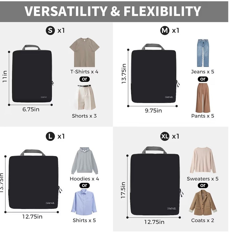 Versatile Sizes: Multiple cubes in the set allow you to separate different clothing types — jackets, sweaters, underwear, socks, and more — for quick and easy packing.
