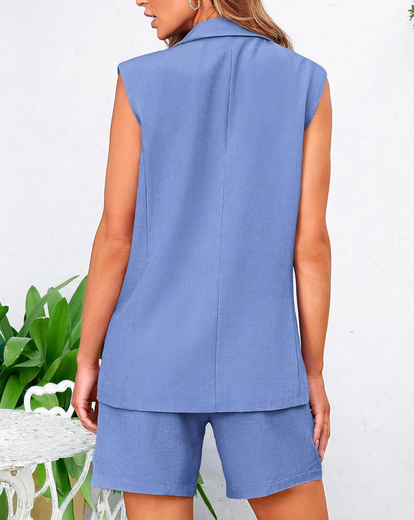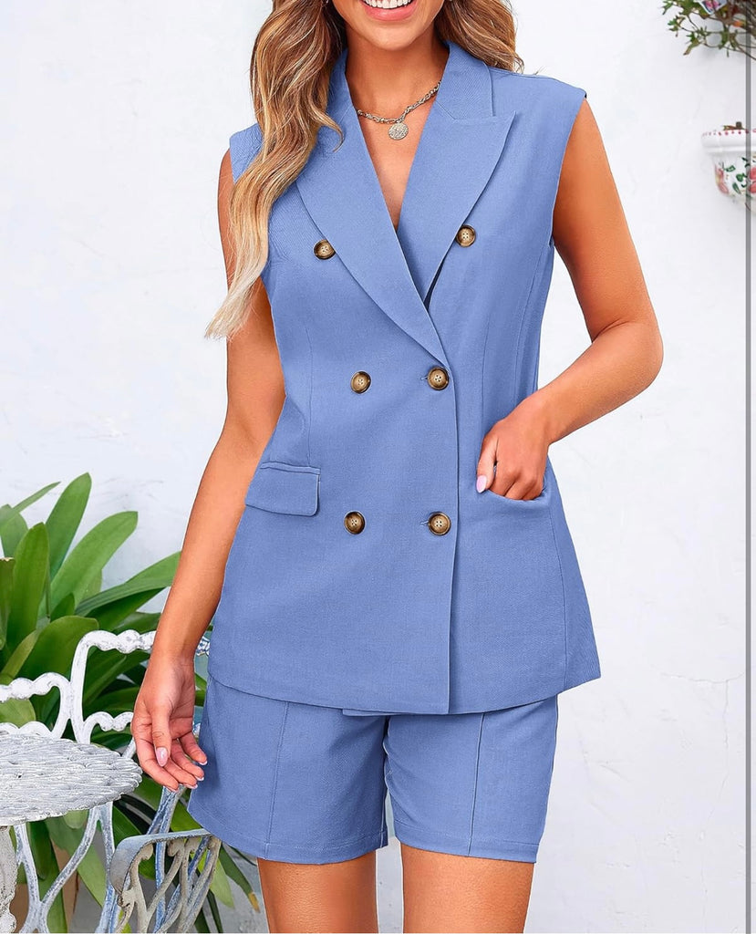 Command attention in the Blair Power Set — a sleek, sleeveless blazer with matching high-waisted shorts. Tailored to flatter, this 2-piece look blends polish and edge, perfect for summer meetings or weekend brunch.