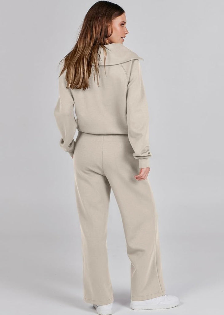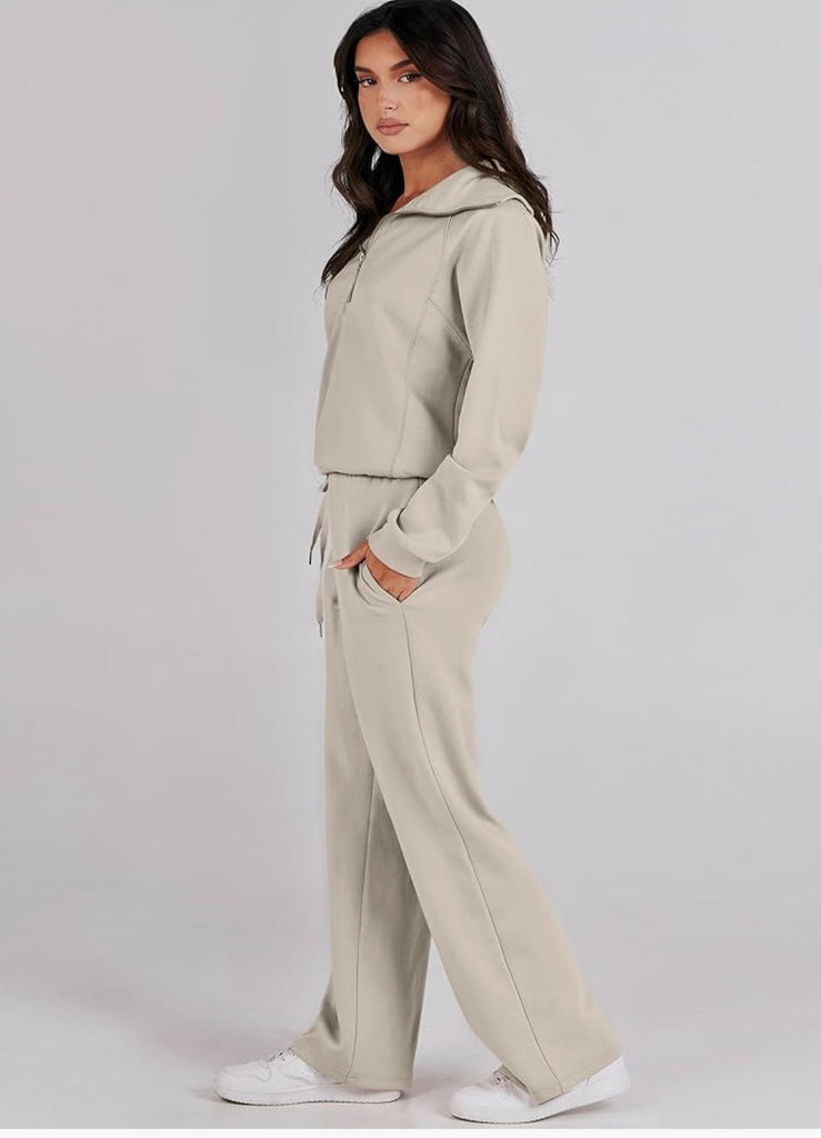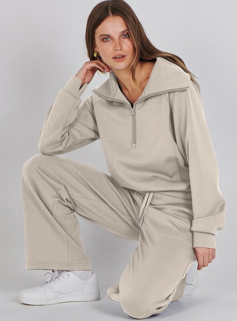 This soft, medium-weight set features a half-zip oversized sweatshirt and high-waisted drawstring wide-leg pants, designed to flatter every body type while keeping you cozy and confident.