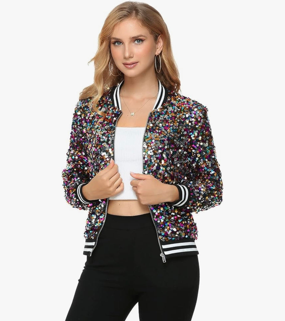 Shine bright in this dazzling women’s sequin bomber jacket, designed to make you stand out wherever you go. The open front zipper closure, ribbed collar, cuffs, and hem add a touch of modern edge to its timeless silhouette. Crafted from colorful, high-quality fabrics with a soft and comfortable lining, this jacket combines style and comfort effortlessly.